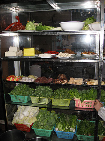 至於周遊雲南各州,菜色其實也沒什麼變化,土豆(馬鈴薯)應該是他們常有的菜色,有馬鈴薯泥、清炒馬鈴薯、馬鈴薯炒酸菜、馬鈴薯炒青椒、馬鈴薯絲煎餅,諸如此類,我都覺得好像到了墨西哥,反正吃來吃去就那幾樣菜,重點是,在這裡絕大部份你必須自己當「大廚」,店家通常就是讓你進廚房看今天櫃子裡有哪些菜,至於怎麼配菜,就得靠你自己啦!放心,人人都有機會當大廚,一開始不習慣,久了保證可以訓練自己配菜功力與下決定的速度。