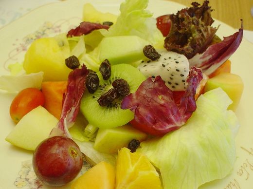先上來生菜水果沙拉,拌上優格醬和水果酥(再度光臨的好友說是用水果炒乾碾碎成的調味料,吃起來脆脆的),對愛吃沙拉的大貓來說,很爽口很開胃。