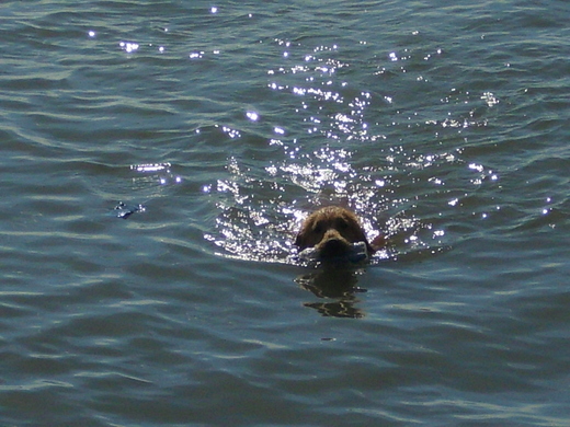 MANGO游向寶特瓶,有趣的是牠竟然會估測水流速度與流向,像是等著寶特瓶飄到面前似的,輕鬆的啣回瓶子上岸。