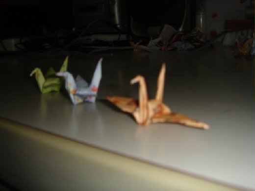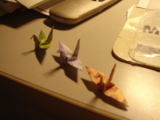 之前某一天.突然想到阿公很喜歡紙鶴.紙鶴又有著祈福作用.所以我決定做紙鶴給阿公.但是卻忘了怎麼做...想想班上同學誰會.牛~她會啦~!!果真問對人了.牛做的方式跟一般的不同.感覺又美.精緻了些.雖然步驟多了些..最後決定要去買紙.到了台北車站.還有毛.去挑紙.結果挑了3家.終於挑到了.(牛還一直怕帶我們去的地方沒有...哈哈.有什麼關西..^^) 到了老麥.3個人就開始狂做紙鶴.牛.毛做的超快了..多了我好以幾隻.雖然做紙鶴感覺很平常..不過當天心情卻很難說..同學幫我折紙鶴.我們最後做了200隻.要送給我阿公.雖然我做不到一半.但是那些紙鶴.卻是容了大家的祝福.有時候覺得.這些同學為什麼要幫我摺紙鶴?或許吧!大家只是同學一場.不過你們.人真的很好.當天沒跟你們說謝謝...真是sorry..唉..真不知道該怎麼說.最對不起的就是牛..謝謝你一直帶拖鞋給我穿.每次你都為我做很多.但是你要我做的事情(45問)我都還沒用.....你常常一直付出..你和志成都很好.希望明年.他會保證上台南一中!!牛你一向驕傲的事情.嘿黑~也要繼續自信下去喔.哈哈相信你會的!!最後也要謝謝小不點啦!!你也奮力的折好多..折到手酸.相信我阿公.有你們大家的祝福.一定會好很快!!謝謝你們