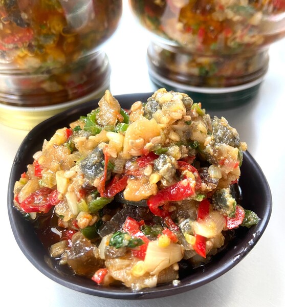 這道菜接近湘菜的「擂辣椒皮蛋」把它成為罐頭食品用在拌麵拌飯或涼拌.熱炒豆腐就成為簡單的皮蛋豆腐,對於工作人和居家人來說都可以簡易地配搭任何食材,選用不同辣椒不一定顯辣,而是辣椒的椒香 👍