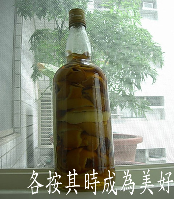 這瓶釀了多年的柳丁皮是用酒釀著的,早就忘了是要用來釀柳丁酒還是用來釀清潔劑的?
