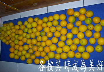 我家這回的一大箱柳丁摘自星期天那又冷又微雨的雲林古坑區,免費宅配送來的時候裝在大箱子裡恐有潮溼發霉的危機,所以就先舖在地板上晾一晾。