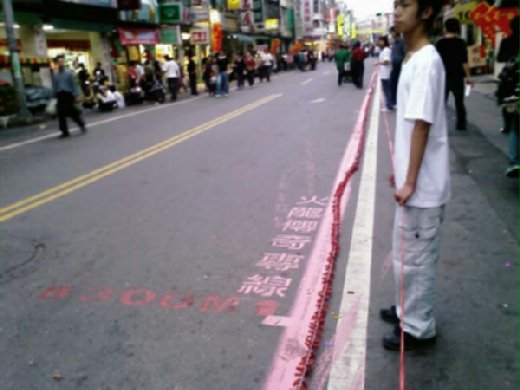 因為去的匆促,所以忘了帶我們家小白,所以只能用手機拍一下。上面這個就是傳說中的火龍。根據我11號線民的回報,火龍分為ABC三支線呢!而這個點正是提供我們安全觀看蜂炮的店家---金振利金香舖的門口。(感恩.感恩)