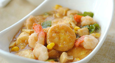 原料:蝦;玉子豆腐(日本豆腐);玉米粒;筍;青椒;蔥;姜;蒜;