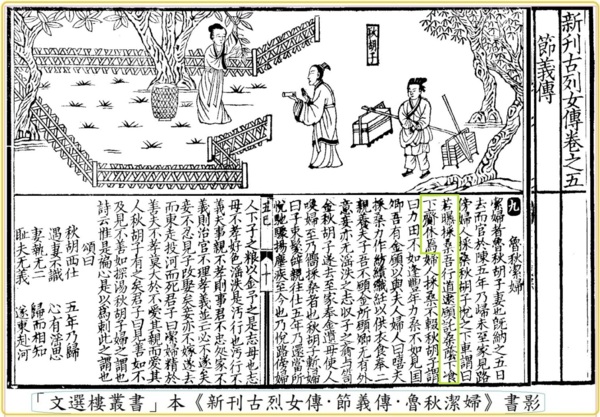 第五個寫作「曝」字的是劉向(77?—6B.C.)。他在《列女傳·節義傳·魯秋潔婦》裡說:「潔婦者,魯秋胡子妻也。……『若曝採桑,吾行道遠,願託桑蔭下飡,下齎休焉。』…」(全文詳見所附:「文選樓叢書」本《新刊古烈女傳·節義傳·魯秋潔婦》書影)。這是《桑園會(秋胡戲妻)》戲劇的原型刑。文中秋胡那句話是說:你在太陽下採桑好辛苦哇!我走了好遠的路也夠累的;我想借你這桑樹的樹蔭下休息,你也來吃點兒點心喝點兒水吧!「若曝採桑」的「曝」就是「暴」的俗字,「曝曬」的意思,「曝曬」的「曝」今讀「ㄆㄨˋpù」。