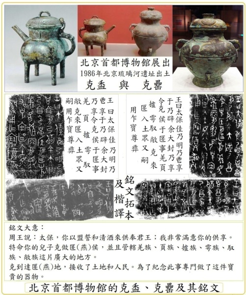 至於「分子」一詞不但在《春秋穀梁傳》的整部書未再出現,《春秋三傳》中也沒有此詞,甚至《禮記》裏都找不到;這可能與北燕受封的情況有關;據司馬遷(145 5—87B.C.?)《史記.燕召公世家》說:「召公奭與周同姓,姓姬氏。周武王之滅紂,封召公於北燕。」時間大約是1046B.C.,已是3000多年前的事情,文獻的記載不夠清楚,遭受秦火等人為的破壞後,口耳相傳的史料更是「故事化」得虛實難辨;所幸1986年北京市房山區琉璃河遺址1193號大墓出土的「「克盉(ㄏㄜˊhé調和酒與水的器具)、克罍(ㄌㄟˊléi盛酒或水的容器)」兩件西周早期銅器,器身及器蓋各有43字銘文,內容相同,記錄銅器主人「克(召公奭的嫡長子)」到封地「匽(燕)」而鑄器留念的緣由,可以印證、彌補或訂正這段歷史的文獻(詳見「北京首都博物館的克盉、克罍及其銘文」)。
