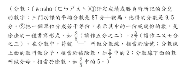 《辭海》的「分子」第二義與《辭源》的第四義相同;只是《辭海》「分數」條作「分數:㊀(Fraction)數學名詞。表示除法之式,可於被除數之下作一橫線,而更書除數,則其商謂之分數,亦曰命分;被除數謂之分子,除數謂之分母。如以b除a,可以a/b表之,a/b為分數,a為分子,b為分母。㊁考試、競賽以及學生作業時之成績,用數字以表示其優劣者,亦曰分數,如六十分、八十分之類是。」比《辭源》多了「成績數值」之義;數學的「分子」音「ㄈㄣㄗˇfēn zǐ」。
