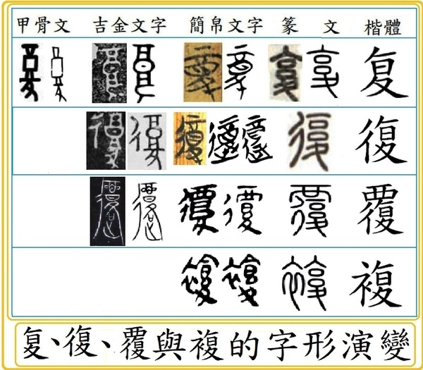 既然「復、複」都是「复」的簡化字,我們不得不也研究「复」字;《常用國字標準字體表》裡也有「复」字,只是它比較不常用,放在次常用乙表,編號作B00605號;就文字的進化過程來說,殷商的甲骨文就有「复」字,周朝的吉金文字才出現「復」與「覆」字,「複」則更晚,到周朝末年的簡帛文字才出現。