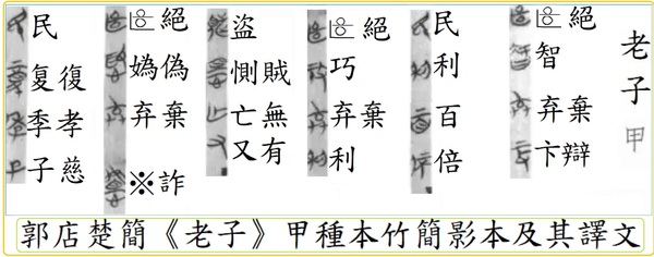 (詳見:郭店楚簡《老子》甲種本竹簡影本及其譯文),其文作「絕智弃(棄)卞(辯),民利百倍;絕巧弃(棄)利,盜惻(賊)亡(無)又(有) ;絕媯(偽)弃(棄)※(詐),民复(復)季(孝)子(慈)。」(「孝」訛作「季」顯然是手民之誤),意思是「拋棄計謀與詭辯,人民可以得到百倍的利益;拋棄投機取巧與爭利之心,就不會有偷盜與奸詐的事端;拋棄虛偽與狡詐,人民就可以恢復孝慈的天性」,這些「郭店楚簡」我不敢說都是專門給死亡者用的特製「殉葬物」,但是這本「《老子