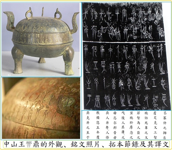 吉金文字的「覆」字只出現在「中山王厝鼎」,這尊戰國時代的鐵足青銅鼎,是1977年出土於河北省平山縣中山王厝墓(一號墓)50餘件銘刻銅器中的第一寶器,鼎高51.5釐米,最大直徑 65.8 釐米,圓腹圓底,雙附耳,蹄形足,上有覆缽形蓋,蓋頂有三環鈕。鼎身「刻」有銘文 469 字,記述中山國討伐燕國、開疆闢土的事件(詳見「中山王厝鼎的外觀、銘文照片、拓本節錄及其譯文」)。