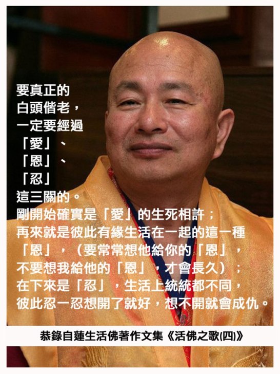 要真正的白頭偕老,一定要經過「愛」、「恩」、「忍」這三關的。剛開始確實是「愛」的生死相許;再來就是彼此有緣生活在一起的這一種「恩」,(要常常想他給你的「恩」,不要想我給他的「恩」,才會長久);在下來是「忍」,生活上統統都不同,彼此忍一忍想開了就好,想不開就會成仇。