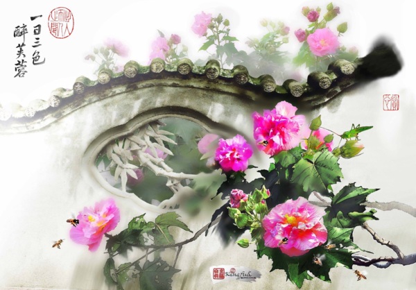 圖/為傅金福先生水墨寫真. 一日三色醉芙蓉