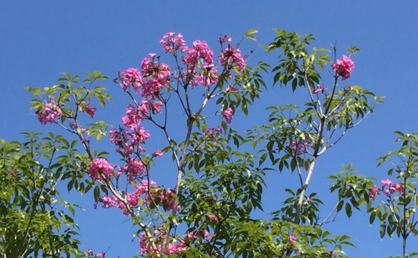 蔚藍的天 洋紅風鈴 碧綠的葉