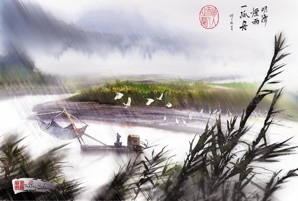 霧鎖明潭寒雨落 蘆荻搖曳渚洲邊