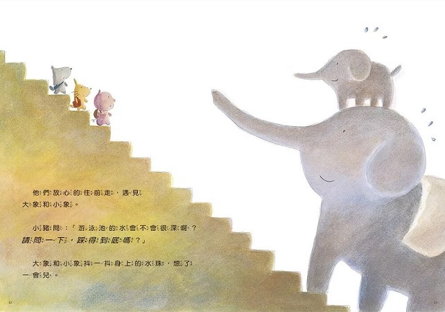 文/圖:劉旭恭 出版社:信誼 夏日裏小狗、小貓、小豬一起搭公車, 來到山裏的游泳池, 不會游泳的他們, 卻忘記將游泳圈帶下車, 陸續向遇到的恐龍、大象、大熊詢問: 「請問一下,踩得到底嗎?」 都得...
