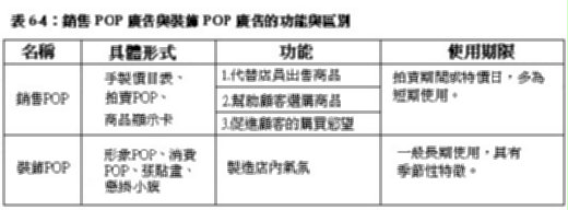 招牌POP:包括店面、布幕、旗子、條幅、電動字幕等,其功能是用來向顧客傳達企業識別標誌、銷售資訊。