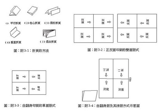 折頁是指將印刷好的書刊及單頁印刷品按照頁碼的順序折疊成一定規格幅面的工作過程。在開始進行出版物工藝設計時,首先要確定出版物的折頁方式。在設計折頁方式時,應考慮出版物的開本尺寸、頁數、印刷裝訂設備等。通常書刊中圖文的位置與順序是根據折頁過程中,紙張轉動的情況和折縫的位置而定。目前折頁的方式可分為如圖附3-1所示的平行折頁,垂直折頁,混合折頁,特殊折頁等。平行折頁法和特殊折頁法(包括包心折頁法、扇形折頁法等)多用於折疊長條形的印刷品的設計,如廣告、說明書、地圖、書貼中的表和插圖等。垂直折頁法是應用最為普遍的折頁方法,主要用於書刊的內頁的設計。而混合折頁法又稱綜合折頁法,即在同一書帖中,既有平行折頁,又有垂直折頁。混合折頁法適用於3折6頁或3折9頁等形式的書帖。