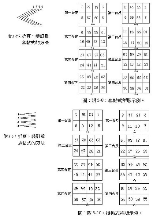套帖式如圖附3-7所示,主要用於騎馬訂。例如一本書刊有64個頁碼,每一帖為16個頁碼(即64P每帖16P),採用騎馬訂,折頁、裝訂為套帖式,則其拼版方法如圖附3-8所示。