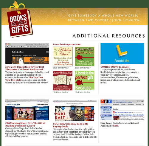 「圖書等於禮品」主題網路視頻由藍燈書屋製作完成。知名公眾人物以及出版商協會成員的簽約作家都在視訊中亮相,並用各自的話語推薦圖書。網站還鏈結了一批出版商的禮品圖書網站。參與此次活動的出版商包括阿歇特、哈潑‧柯林斯、霍頓‧米夫林‧哈考特、海伯龍、約翰‧威立、企鵝、藍燈書屋、西蒙與舒斯特等。