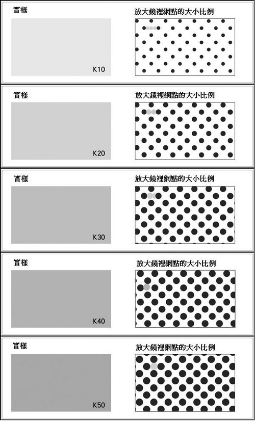 5.黑白各半,兩顆網點之間能容納一顆同樣大小的網點,稱為五成網點。五成以上的網點成數與五成以下的可以互補,即:四成網點與六成網點互補,一成網點與九成網點互補。也就是從六成網點開始,以白點的間距能容納多少同樣大小的白點來判定。