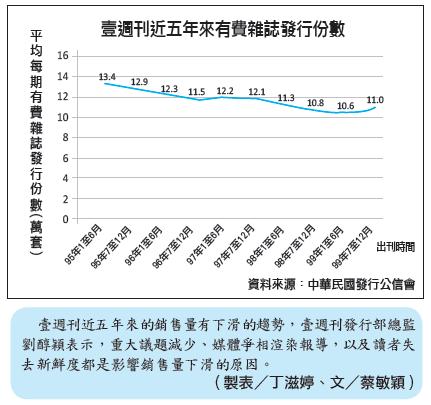 他說,《壹週刊》每週四出刊,刊内新鮮話題往往被其他電視、報紙媒體爭相渲染報導,可能影響讀者購買慾,造成銷售量不穩定。另外,《壹週刊》創刊10年,對臺灣讀者來說,新鮮度可能不如早前,既有忠實讀者平均年齡逐漸升高,未來捉住年輕的新讀者是當務之急。