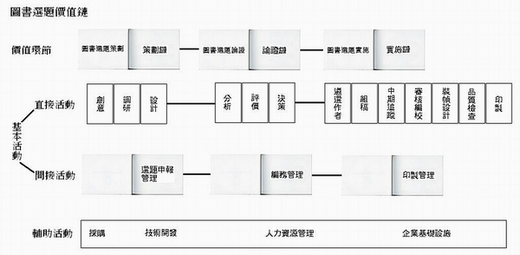 價值活動存在的意義在於它能有效地傳遞和提升價值。根據營運過程分析,企業中的採購、生產、銷售和售後服務與「投入→轉換→產出」過程一一對應,即投入系統主要是採購流程,轉換系統主要是生產流程,產出系統主要是銷售和售後服務流程。圖書選題價值鏈上投入和產出的不同就是資源轉換的結果,而轉換的本質要求是增加價值,即在對出版資源進行轉換後必須為企業增加價值。圖書選題價值鏈透過各項價值活動實現了企業的價值增值,因此可以把它視為一條加值鏈進行管理。