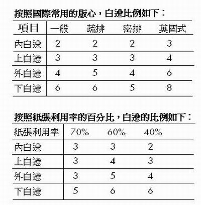 1.把開本的寬度分為3等份,版心占2份。餘下的l份再分為3等份,其中內白邊占1/3,外白邊占2/3,上白邊占1.5,下白邊占3。
