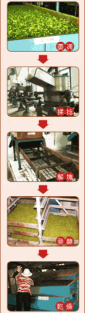 ( 茶葉採摘 )→ 萎凋→ 揉捻→ 解塊→ 發酵→ 乾燥→ 精製分級