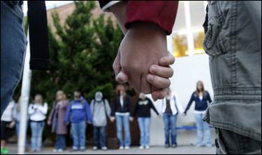 沒想到天氣雖然清冷﹐並沒有削減學生願意禱告的熱忱。從六點十分開始﹐人就陸陸續續的前來﹐一些老師和載學生來的家長也加入禱告。沒有一個明顯的帶領人﹐各人或開聲﹐或安靜默禱。七點整﹐上課前的預備鈴響起﹐有課的老師先離去﹐學生們還佇立原處﹐牽著的手捨不得放開﹐多人的臉上帶著淚痕。