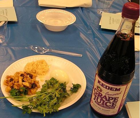 大家按序坐下。每張桌上擺著由新鮮葡萄直接壓榨,沒有摻水的純葡萄汁,兩小盆水,碟子裡有 Karpas( 香菜 ) 、 charoset( 乾果、葡萄乾和水果丁混合 ) 、 maror ( 磨碎的苦山葵泥 ) 、和 hagigah( 蛋 ) ﹐ 以及三片有紙巾覆蓋的無酵餅 (matzoh) 。牧師的桌上還有蠟燭﹐他的碟子裡另有一隻 zeroah( 羊腱骨 ) 。這些東西都有其象徵意義。