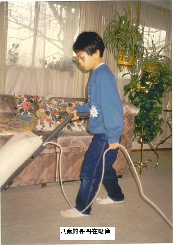 老大八歲開始﹐撢灰吸塵就是他每週賺取零用錢的工作。他作到十四歲﹐「昇格」去割草﹐這個美差落在小他四歲的弟弟身上。弟弟比較「幸運」 ( 還是倒楣﹖ ) ﹐在哥哥出門唸大學之後﹐既要吸塵﹐還要割草。不過零用錢當然也雙倍啦﹗