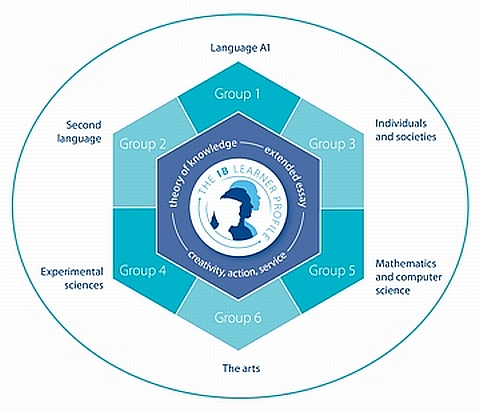 IB 學科分六個組別﹐第一語文 ( 母語 ) ﹐第二語文﹐社會學﹐科學﹐數學和電腦科學﹐以及藝術。文憑需要學生選修每個組別所開的課﹐必須修三個 ( 或四個 ) 高級水平科目 (HL) ﹐以及三個 ( 或兩個 ) 標準 水平科目 (SL) 。學生修完需要學科﹐最後要參加文憑鑒定考試﹐每科七分是滿分﹐總分四十二分﹐至少要二十四分才能拿到文憑 ( 當然還包括修過 TOK ﹐論文通過審核﹐以及完成 CAS 時數 ) 。