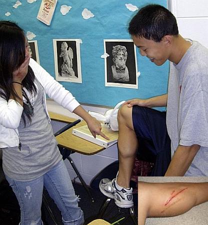 (跳低欄摔跤﹐長長的傷口﹐居然還得意的秀給女生看﹗)