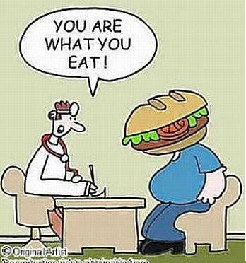 你剛好相反。過冷過熱、燒烤煎炸的不吃﹐晚餐過後刷了牙就不再進食。一年外食次數﹐屈指可數。外出旅遊﹐非不得以﹐不吃漢堡速食。咖啡可樂與你無緣﹐而蔬菜水果費用佔我們家伙食支出大宗﹐從早到晚﹐少則5、6樣﹐多的時候﹐十來樣也有。家裡自製的麵包﹐以全麥為主﹐米飯是糙米﹐肉呢﹗不是肉絲就是肉片﹐連你加薪﹐我也沒給你煎一塊T骨的嫩牛排。還擔心你蛋白質攝取不足呢﹗再戒蛋和奶﹐我看你那幾兩肌肉也要化掉了。」