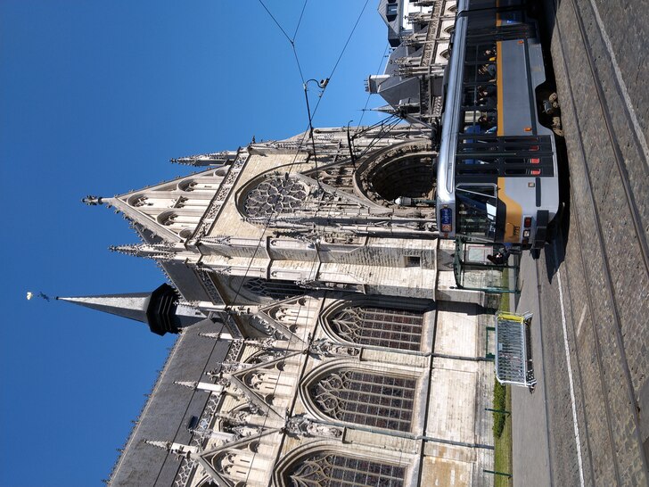 這座外觀帶著火焰式哥德樣式的美麗教堂,周遭有部分公家機關建築,同時也有大小薩布隆兩個廣場,鄰近有不少古董店及商家,相當的熱鬧。