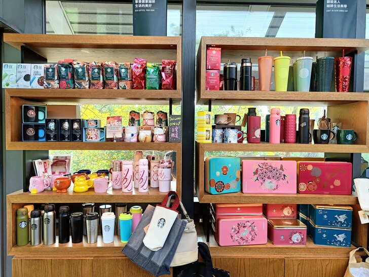 而琳瑯滿目的周邊商品,像是杯子、提袋、零食等等,雖然價格不斐,打著當地或當店限定的訴求,仍吸引不少人買單,有人就以搜集城市杯為樂,為旅行增添回憶。