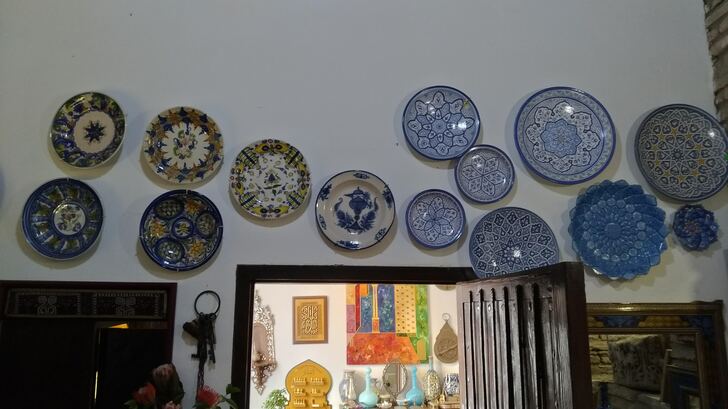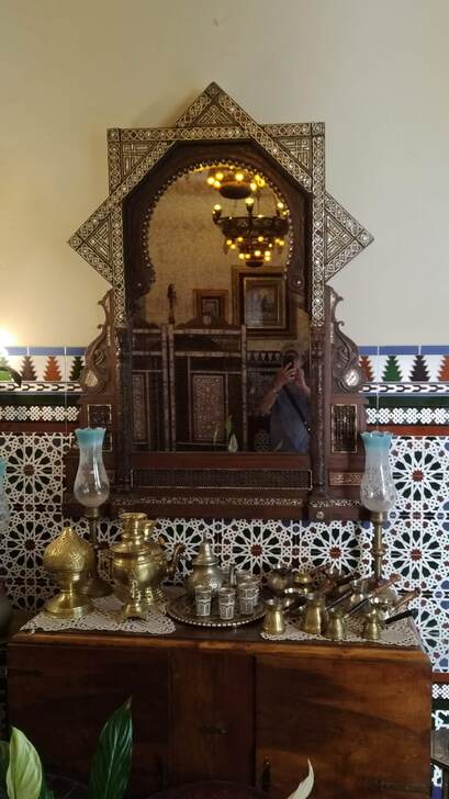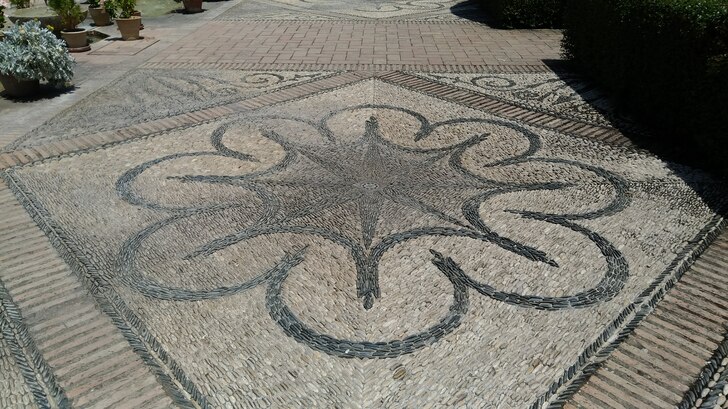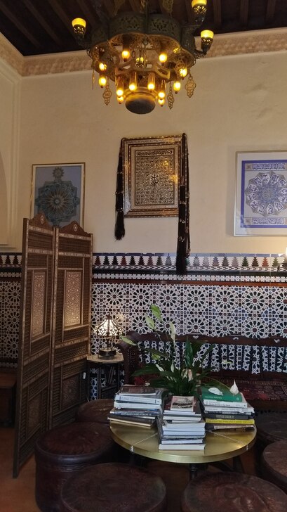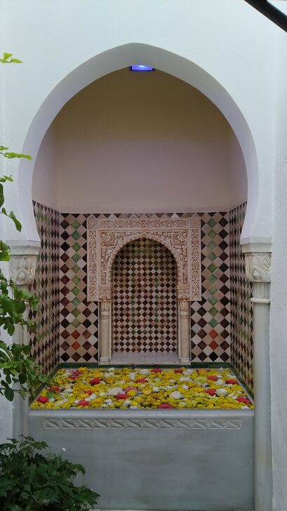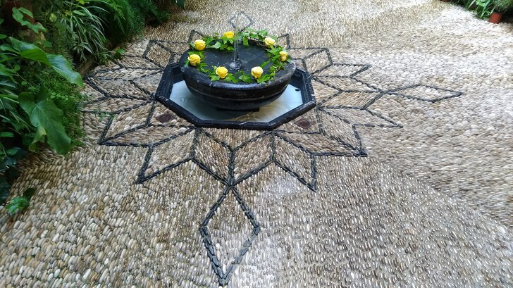 無論是中庭或是屋內,都保有濃濃伊斯蘭風格,例如噴水池下方用石頭排列成幾何圖案。