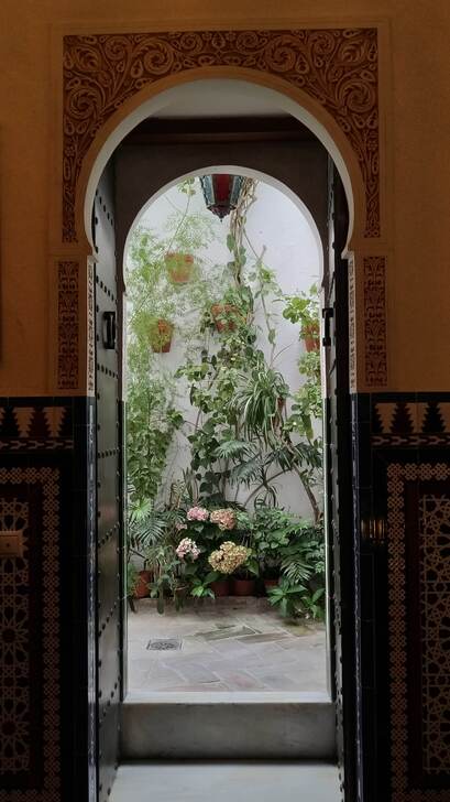 而穆斯林統治期間,更進一步改造,從街道穿越門廊後進入房子,再輔以大量的植物,使得中庭發揮綠意盎然、又能降溫的雙重效果。