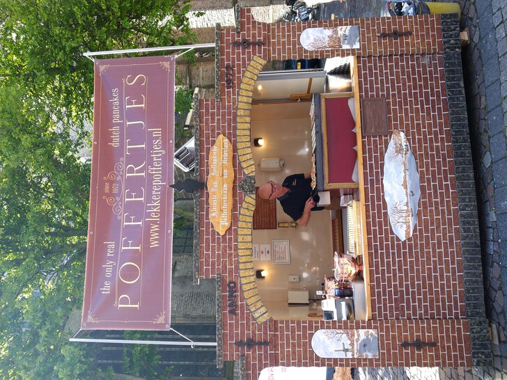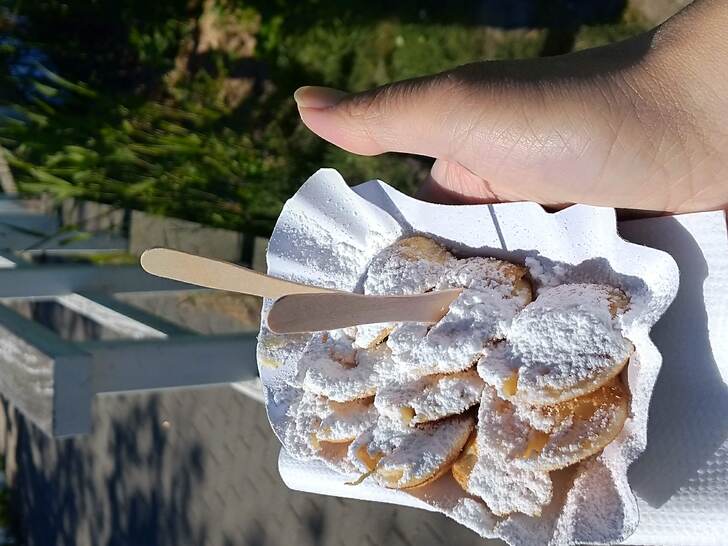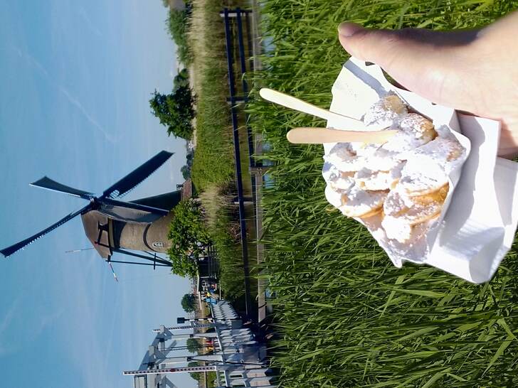 倒是這趟行程中,在荷蘭鹿丹特小孩堤坊有個賣荷蘭小鬆餅(Poffertjes)的攤販,我反倒對這款的味道印象深刻,同樣是灑上糖粉,個人覺得荷蘭小鬆餅比較合我的胃口。