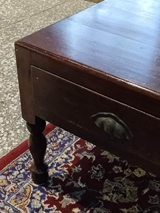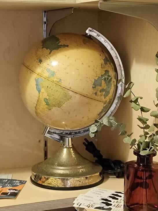 門口有周邊商品販賣區及一小塊放書的架子,吧台另一邊的桌子、桌面由墨綠色磁磚拚成,加上黑色椅子,桌椅色調上的搭配很和諧,店的後方有張大方桌,附近也都有擺古董家具。