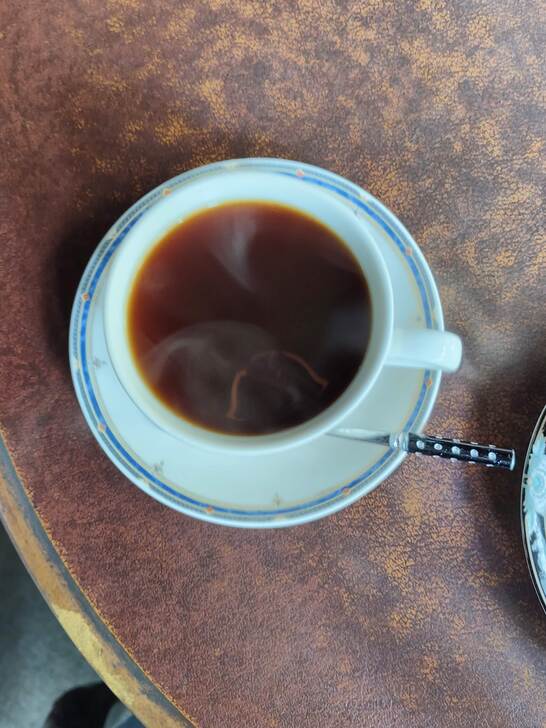 我先到巷子裡找了家便利商店,買了飲料,坐下來吹冷氣。快12點才去咖啡廳,大門是開的,裡面燈還沒有全打開,看起來還沒開始營業,我選擇直接進去,沒想到約好的人已在裡面了。