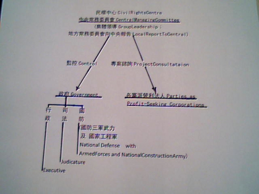 [三]. 新政治架構依照二十世紀末新興的Project Management技術(超連結)來實行『計劃(由民權中心付費個案委託黨派及私人機構辦理』、『監控(民權中心)』、『執行(政府)』三分的管理制度。A new tripod political structure consists of three branches, namely: 『Planning(by political parties and private associations on assignments of Civial Rights Center,oncase-by-case paid basis)』,『Control-and-Supervision(by Civial Rights Center)』、『Executing(by the government)』.