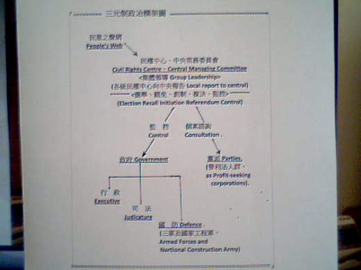 [三]. 新政治架構:舉行全國層級選舉,自戶長互選出鄰長、鄰長互選出里長,向上,選出各階層人民代表、各級常務民代,以迄十幾、二十一位中央常務民代,組成常務中央民權中心,依集體領導方式替人民監控政府為人民服務。用圓桌武士的合作精神,依照二十世紀末新興的Project Management專案管理技術(超連結)來實行『計劃 (由民權中心付費個案委託黨派及私人機構辦理)』、『監控 (民權中心集體領導)』、『執行 (政府是公僕)』的『三分管理制度』。