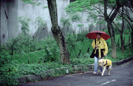 透著樹枝綠影,伴著夕陽餘暉,我遠遠地看到導盲犬Ohara領著牠的主人張國瑞步出辦公室;那天,我們在校園裏碰了頭,時間是五點一刻。我們一起走,到了某處,國瑞停下來說:「以前這裏曾停了一輛貨車,我的手杖打在輪下,以為是平坦的路,往前一走,卻撞個包,頭部流了些血……」我聽了尖叫,他卻乾笑幾聲,笑聲裏,我隱約感到過去他還受過更嚴重的損傷,只是 Ohara 撫平了一切。