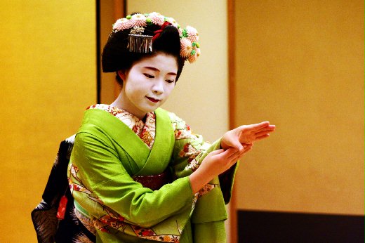 這女孩是舞伎( Maiko)。她得等滿了廿歲,才能成為藝伎( Geiki),衣領