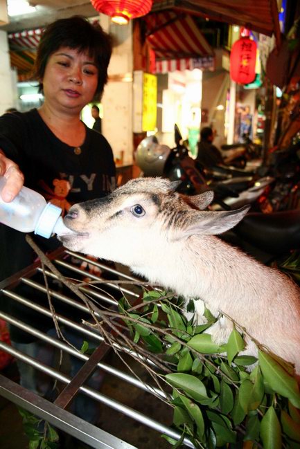來自彰化縣的施姓酪農,為了證明牧場出產的乳品100%鮮純,牽來母羊在河南路黃昏市場現擠,讓人試飲,但天氣實在太熱了,母羊跪在地上氣喘吁吁,酪農怕牠中暑,拿出冰塊讓母羊猛舔,一旁的小朋友則好奇的的問:羊咩咩吃冰塊,擠出來的會是冰羊奶嗎?