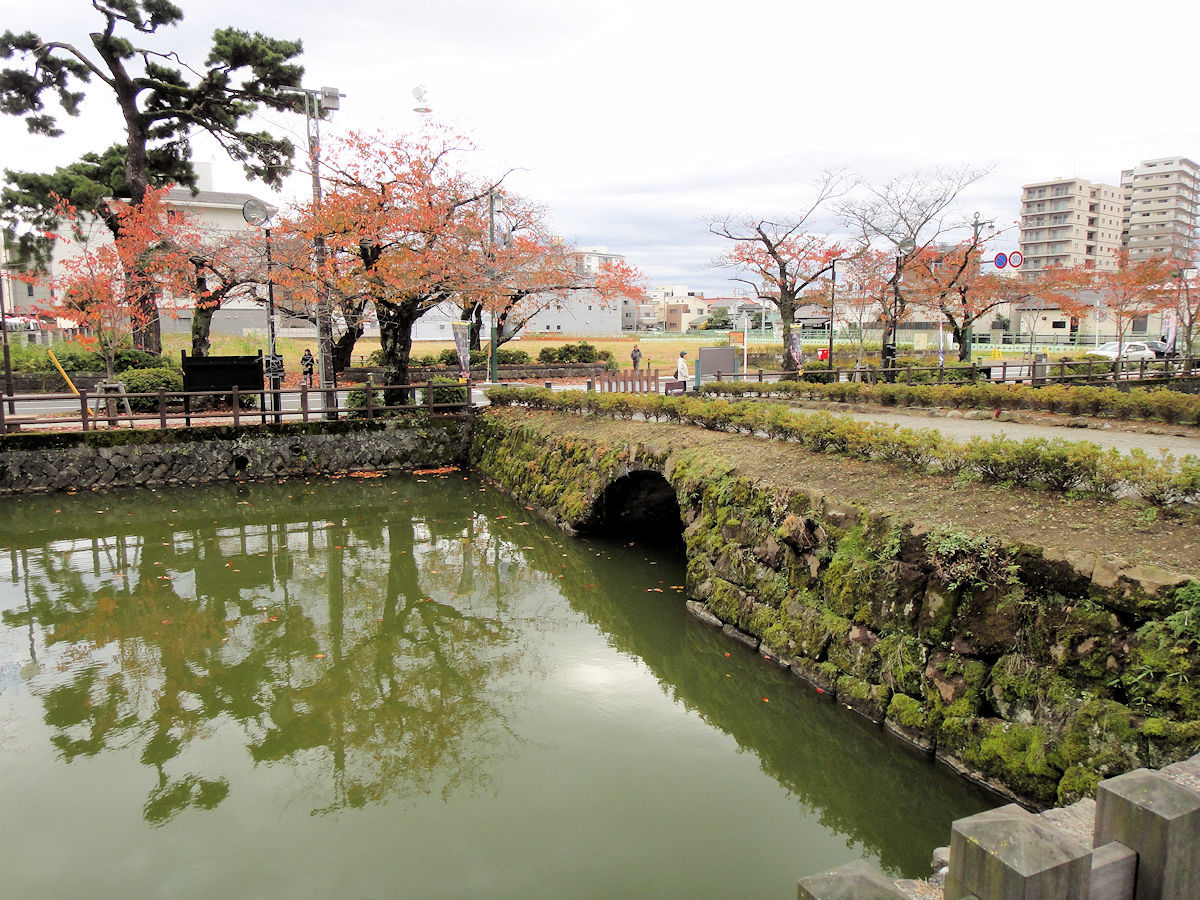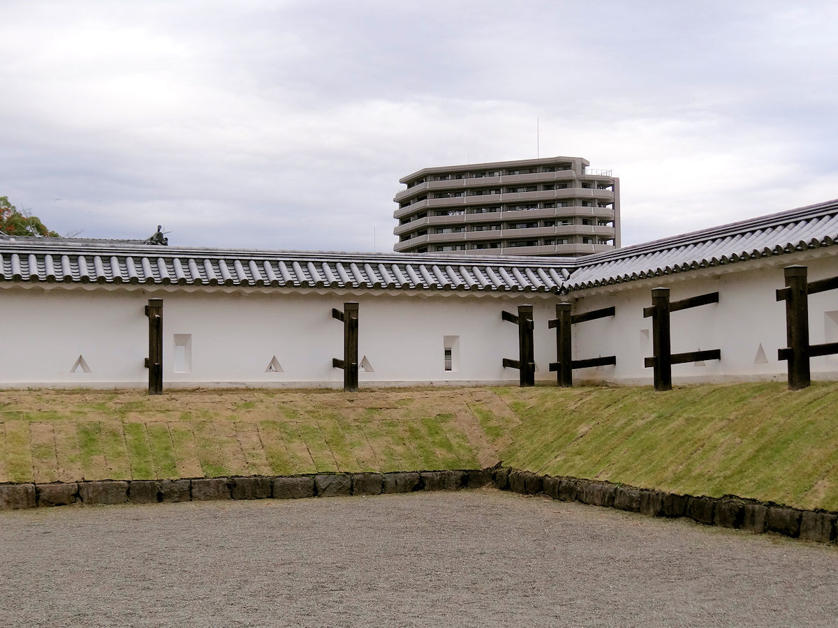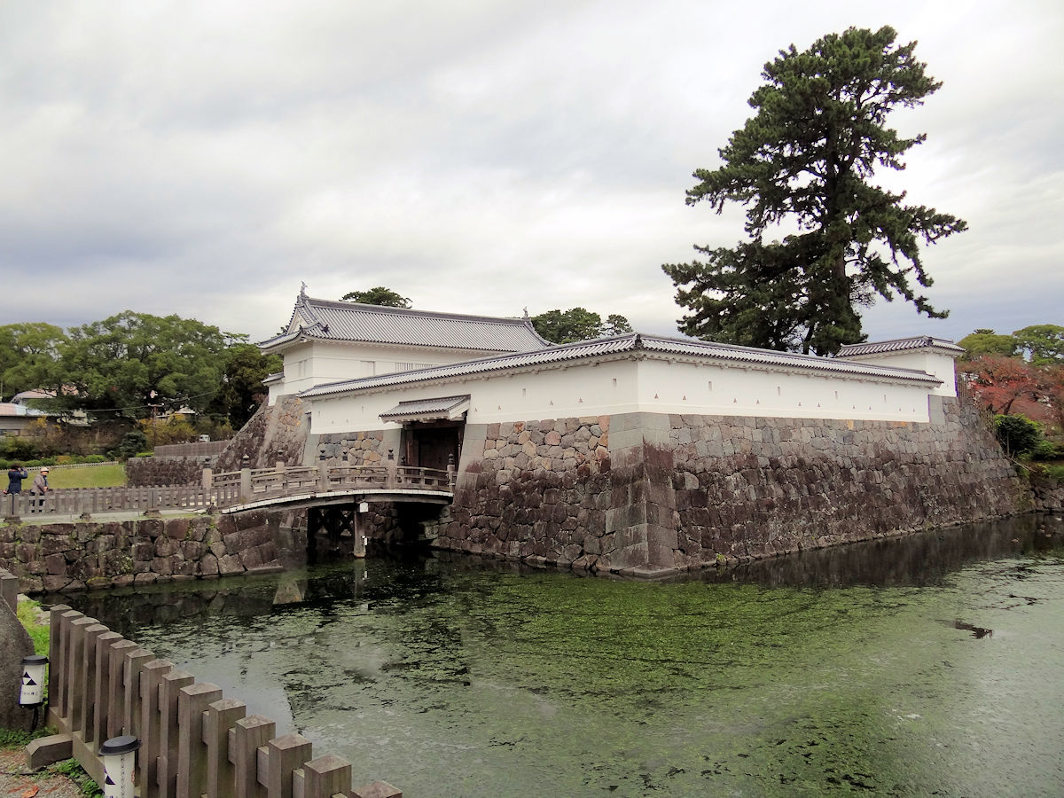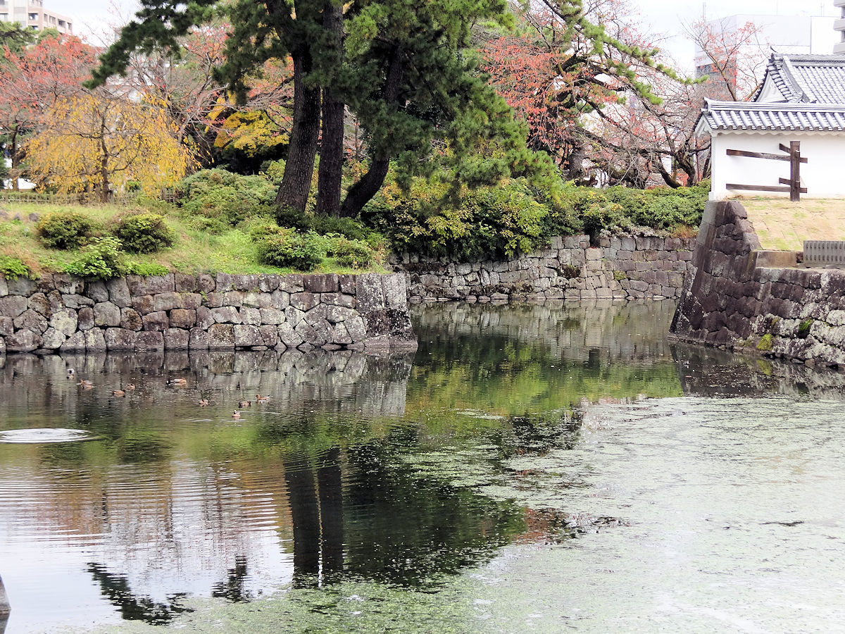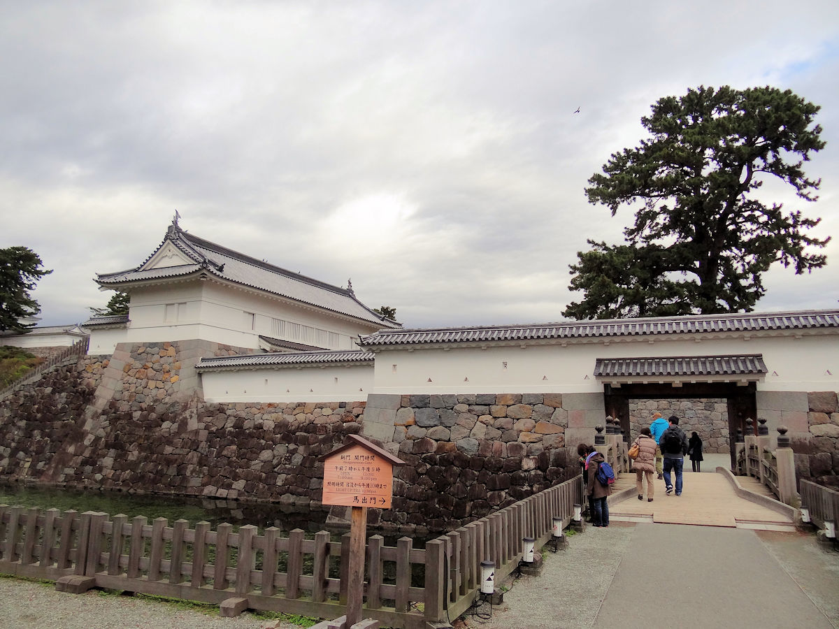 過銅門出甕城有住吉橋,然後是護城河上稱為「馬屋曲輪」的L型島嶼,盡頭又是一座甕城,接著是正門「馬出門」。這段路徑相當曲折,接連四、五個九十度彎,目的應該是困擾進攻者,讓他暈頭轉向摸不著邊。不過這段路,連同外面的護城河,應該是整個城址公園最美的一段。請看照片。