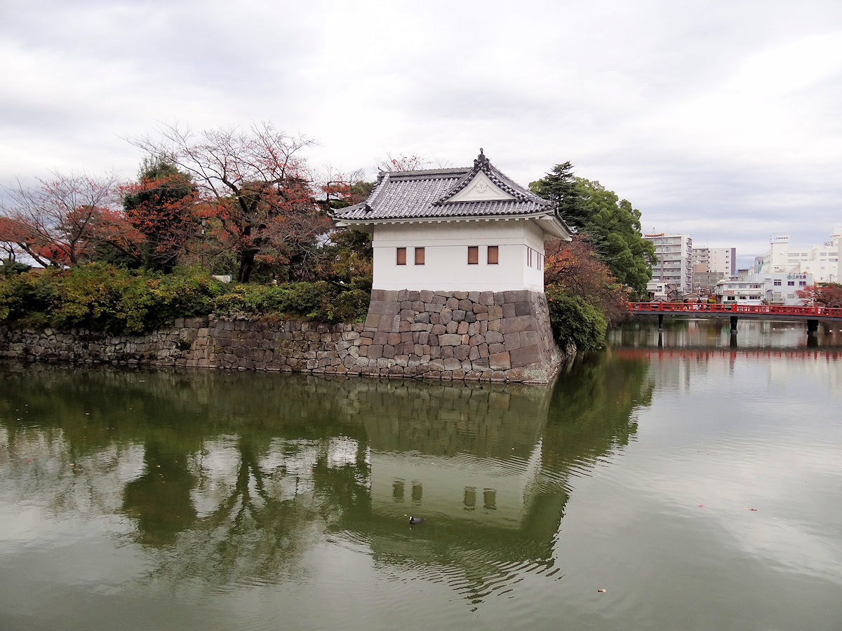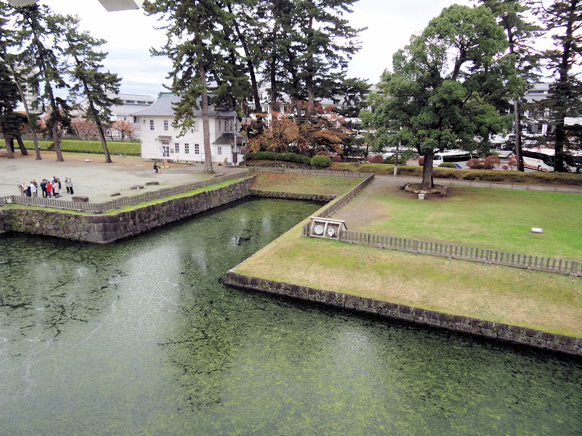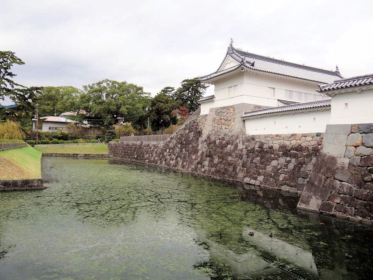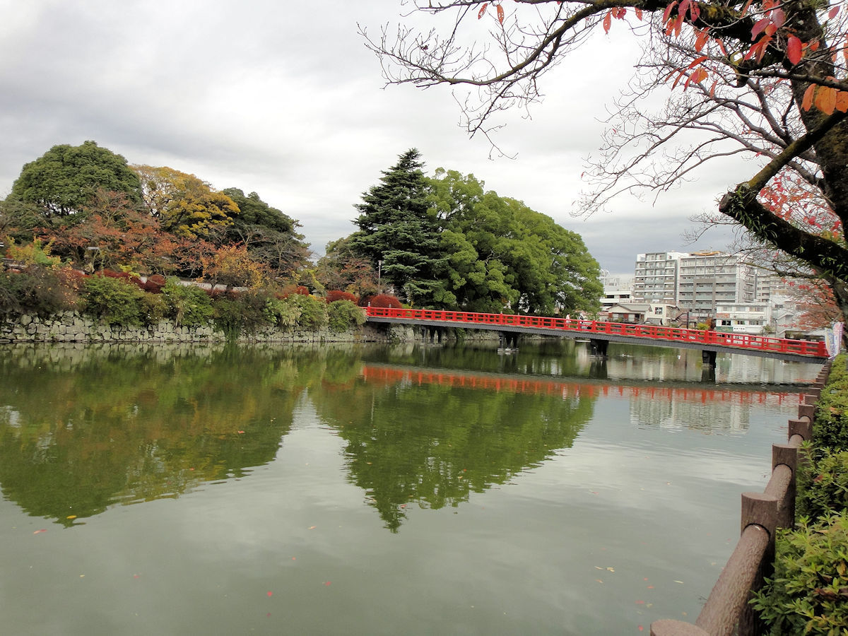 過銅門出甕城有住吉橋,然後是護城河上稱為「馬屋曲輪」的L型島嶼,盡頭又是一座甕城,接著是正門「馬出門」。這段路徑相當曲折,接連四、五個九十度彎,目的應該是困擾進攻者,讓他暈頭轉向摸不著邊。不過這段路,連同外面的護城河,應該是整個城址公園最美的一段。請看照片。