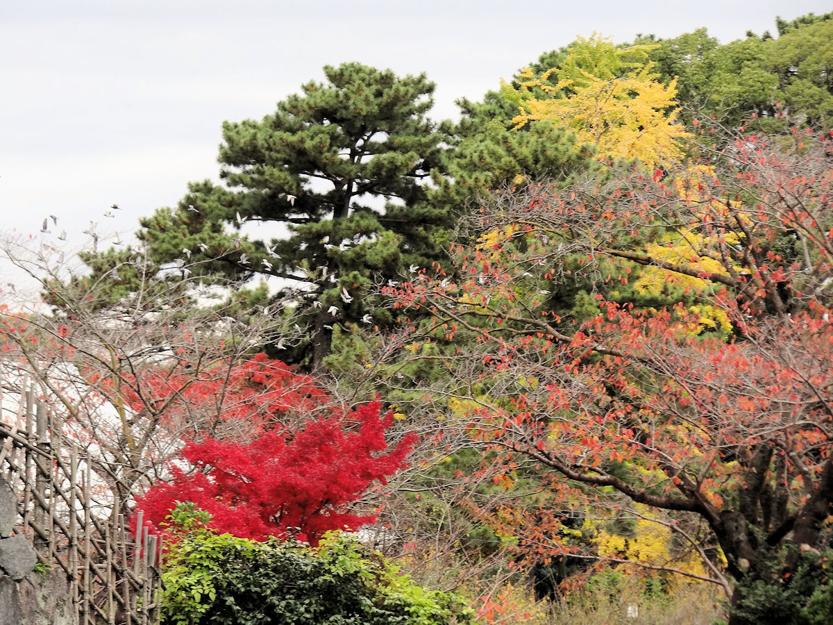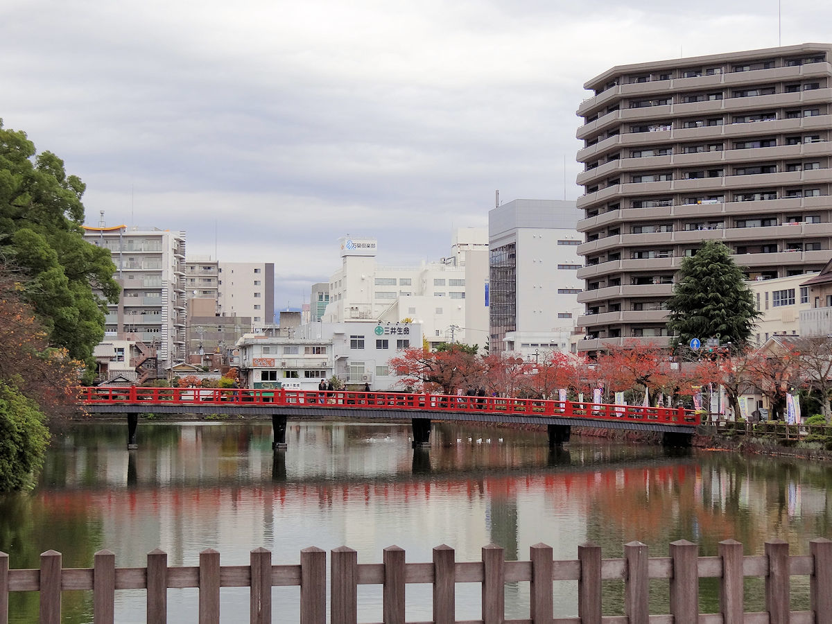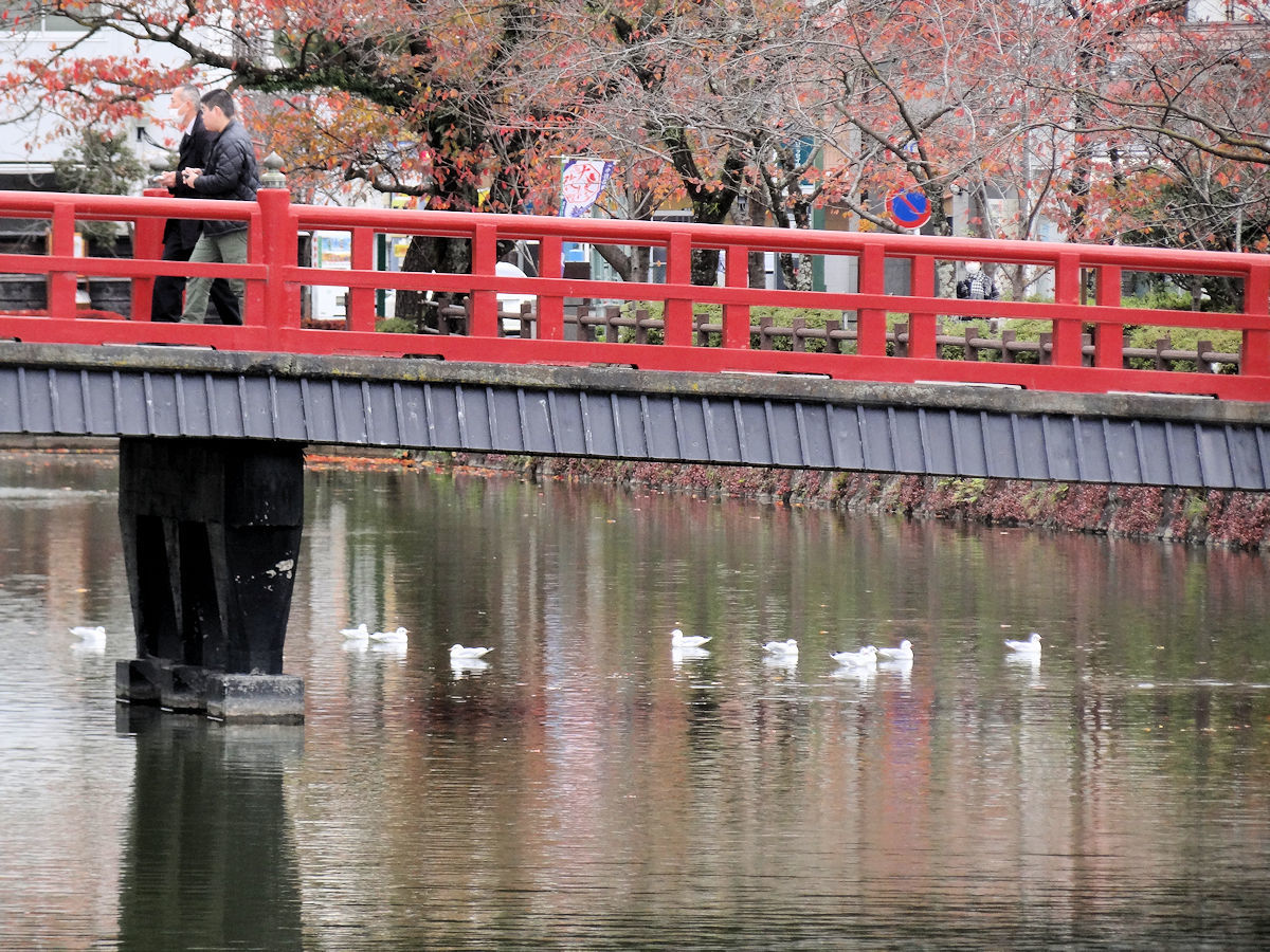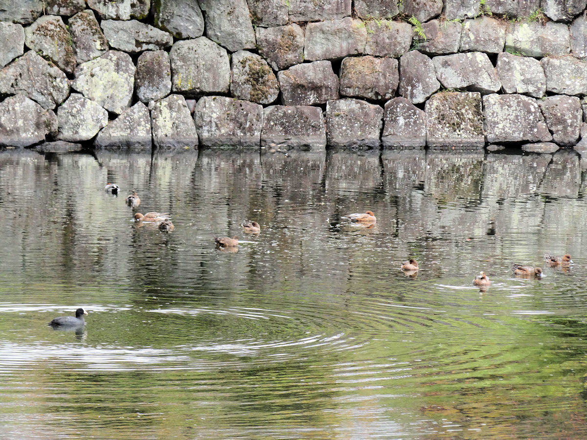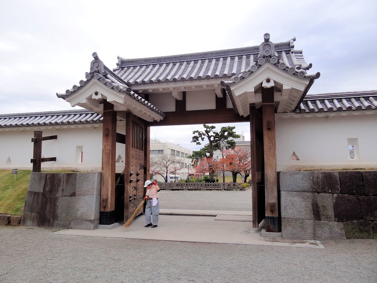 過銅門出甕城有住吉橋,然後是護城河上稱為「馬屋曲輪」的L型島嶼,盡頭又是一座甕城,接著是正門「馬出門」。這段路徑相當曲折,接連四、五個九十度彎,目的應該是困擾進攻者,讓他暈頭轉向摸不著邊。不過這段路,連同外面的護城河,應該是整個城址公園最美的一段。請看照片。